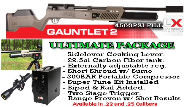 We ship you a Umarex Gauntlet 2 with every upgrade available include your own air source. We go through the rifle from top to bottom. We install and tune the rifle as listed below.