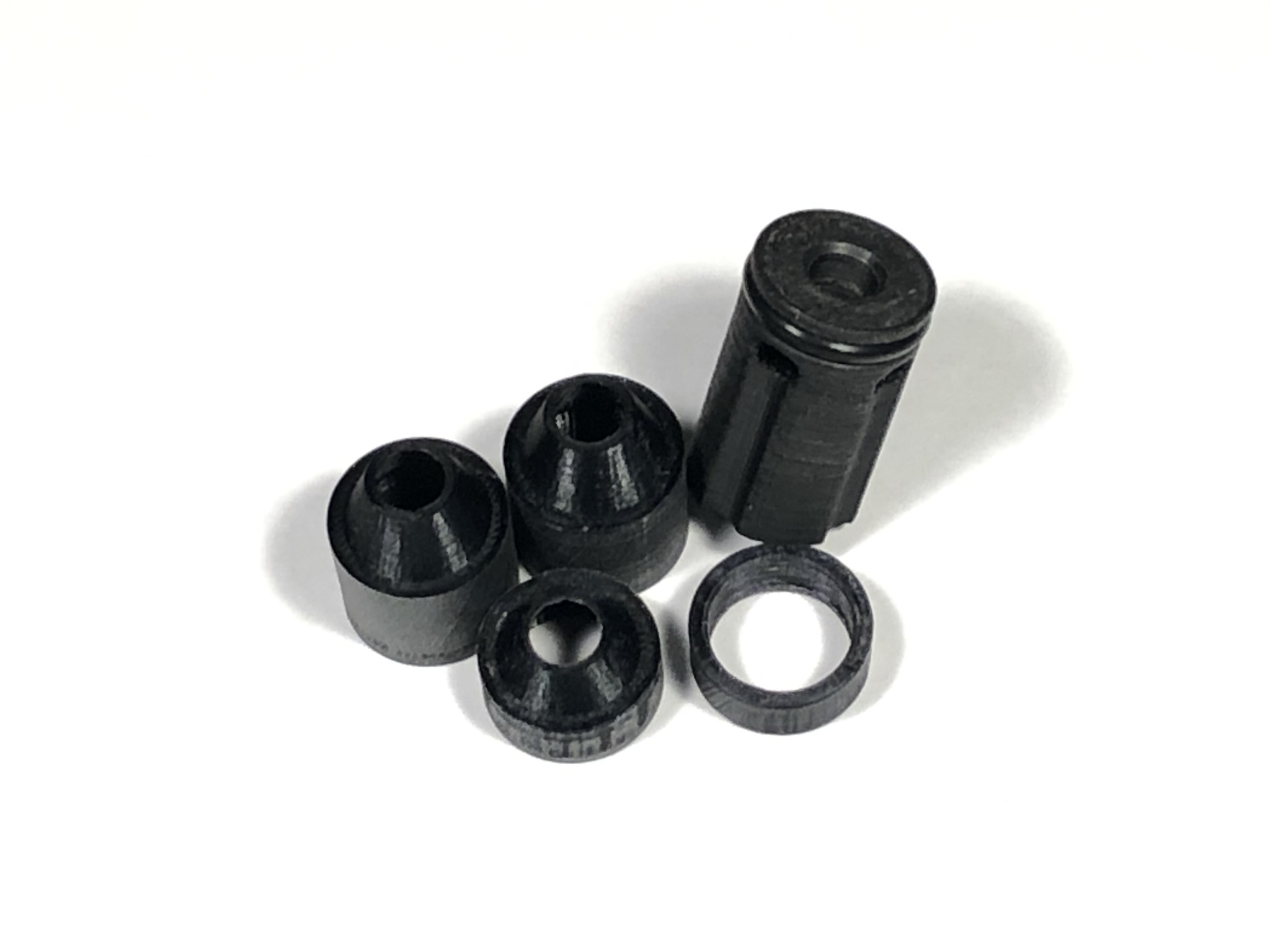 A five (5) piece kit that includes an efficient multiport air stripper that strips and channels air away from the pellet to allow for a more stable and less turbulent pellet launch from the muzzle. The kit also provides baffle chambers to help remove both noise and turbulence in the air stream. The end result is a more laminar air stream which reduces projectile instability and as a secondary benefit, reduces the report of the rifle.