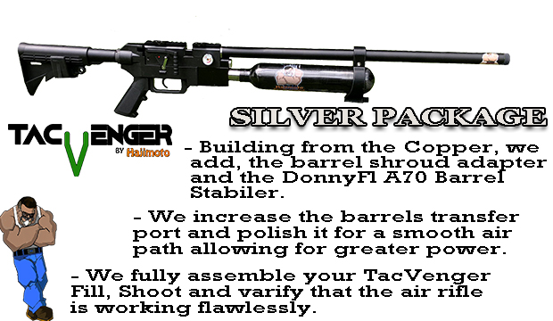 We took the Copper and added the AE Swede CNC’d shroud adapter and the DonnyFL A70 barrel stabilizer with suppressor adapter, and this is also where we start executing some machining enhancements into the rifle to help you get the most efficient transfer of power to the bore. If you add a power plenum to this build, you will have everything you need to whomp things with a higher degree of power and efficiency that can be expected or take a look at the Gold package as it comes with the Power Plenum and tune choice!