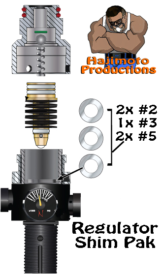 I have put together a very easy and complete stainless steel shim kit so you can adjust your Gauntlets Regulator output. The shims that I have included give you a wide range of adjustability to mix and match different thicknesses to get the regulator to output exactly what you want. The shim kit comes with easy to follow instructions which guide you through the process as to what shims you need to add to typically achieve my recommendations for each Gauntlet Caliber.